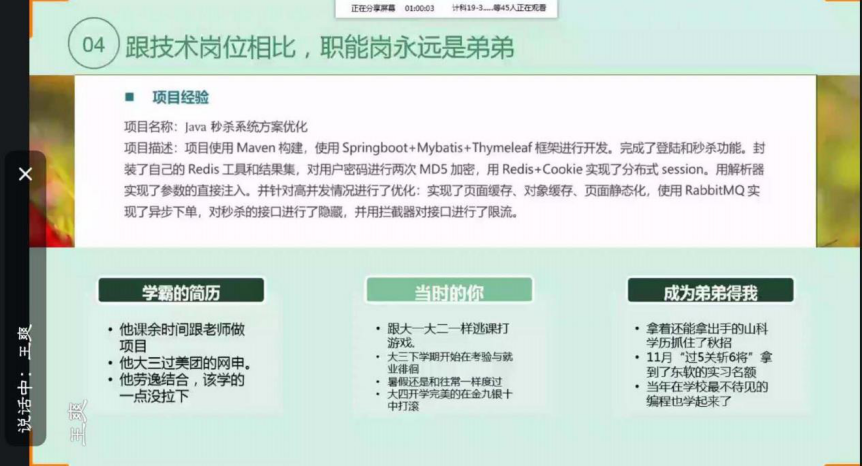修春勇介绍了Java语言在Web开发、移动端开发、客户端开发等方面的广泛市场和较大需求量,以及Java语言相对稳定的良好特点。他建议大家要将课本知识与实践相结合,尽量积累项目经验,要了解并掌握包括核心技术模块、Web前端模块和Web框架模块等课程体系,才能更熟练、灵活地运用语言。